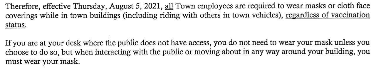 The town administrator allowed workers who had their own office to not wear a mask. This is exception is in direct violation of the actual Sharon Board of Health mask mandate.